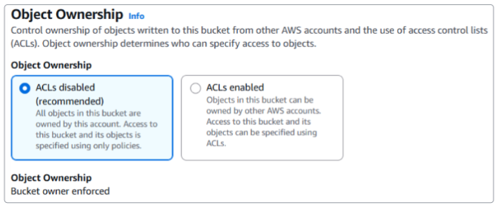 - Let ACLs be disabled because we will be using a policy to control access