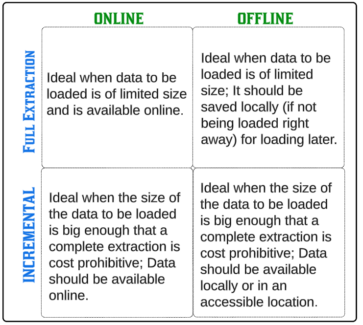 - Data is extracted from the data source when it is online or from intermediary storage that will hold the entire dataset (for small tables) or relevant new/edited data records