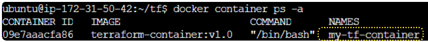 docker run -it -d --name my-tf-container terraform-container:v1.0 /bin/bashStep 7: Confirm Container was created.