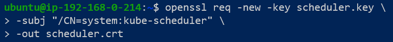 - For scheduler, kube-proxy, kube-controller, etcd, use "/CN=system:<name of component>". For example, if we had to generate a CSR for the scheduler, we would set the description to "/CN=system:kube-scheduler".