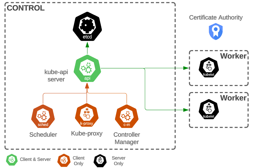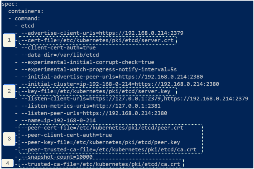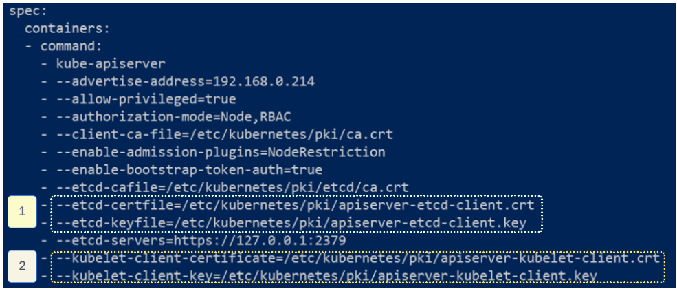 | etcd | kube-API server | etcd.key and etcd.crt are sent by etcd (the server) apiserver.crt and apiserver.key are sent by kube-api (the client) to etcd *In some cases, you may also consider making a special apiserver-etcd.crt and apiserver-etcd.key for etcd only. |