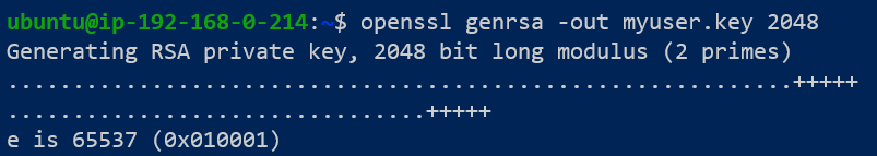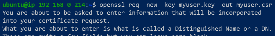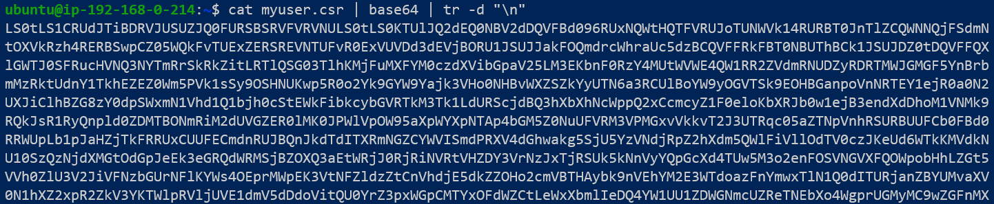 Step 1: Generate a new key and a base-64 encoded CSR for the new user, using openssl.