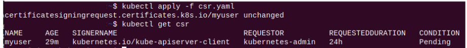 Notice the CONDITION column shows the CSR to be in a Pending state. To change the state of the CSR from Pending to Approved, an explicit approval command for the CSR needs to be issued.