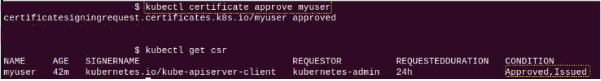- The cluster admin creates a CertificateSigningRequest manifest in kubernetes.